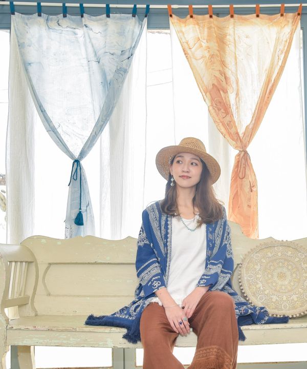 モロッコの大理石のような淡いマーブル模様が美しいカーテン。二枚重なったデザインでその日の気分で雰囲気を変えることが出来る。タッセル付き。窓を開け、風になびく様に魅了される。