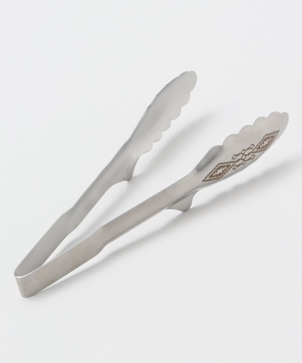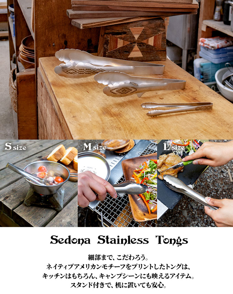 細部まで、こだわろう。セドナの大地のネイティブアメリカンモチーフをプリントしたミディアムサイズのトング。キッチンはもちろん、キャンプシーンにも映えるアイテム。スタンド付きで、机に置いても安心。ステンレス食器の老舗が並ぶ「燕三条」で作られた、職人の技が光る一品。
