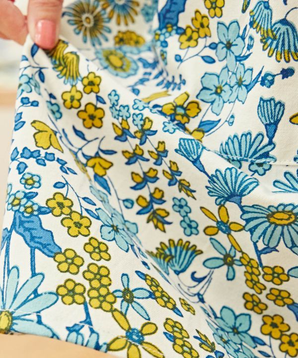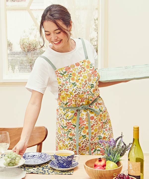 地中海沿岸に咲く可憐な花々をデザインしたエプロンです。あたたかみを感じるコットン素材。両サイドに付いている大きめのポケットにはスマホがすっぽり入ります。フロントで腰ひもを結ぶと女性らしいシルエットに。