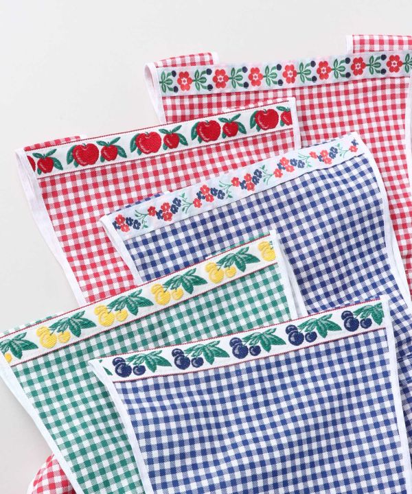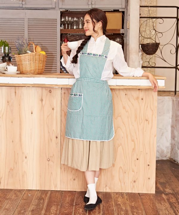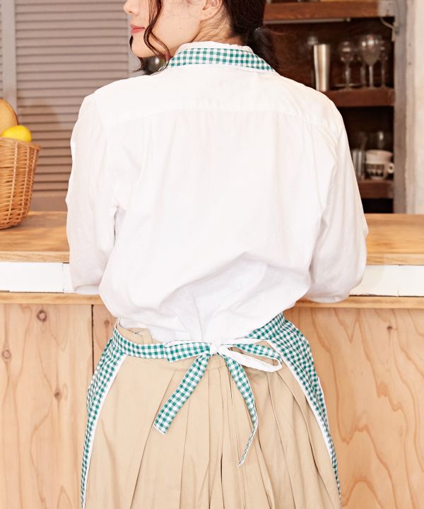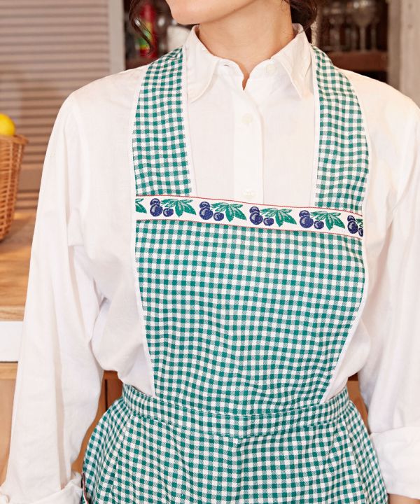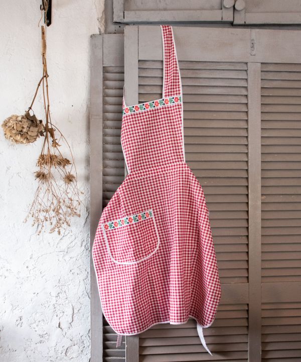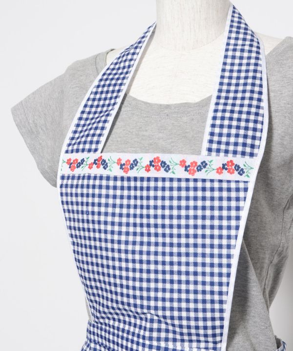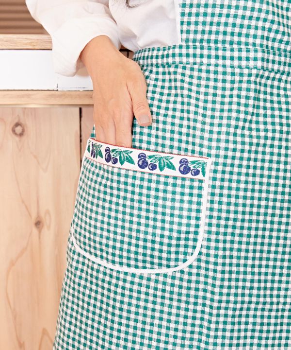 イタリアのロンバルディアから直接買い付けたエプロン。カンパーニュシックでレトロな雰囲気が可愛らしいチェック柄。織りテープがアクセントになっています。便利なポケット付き。※織りテープの柄はアソートです。