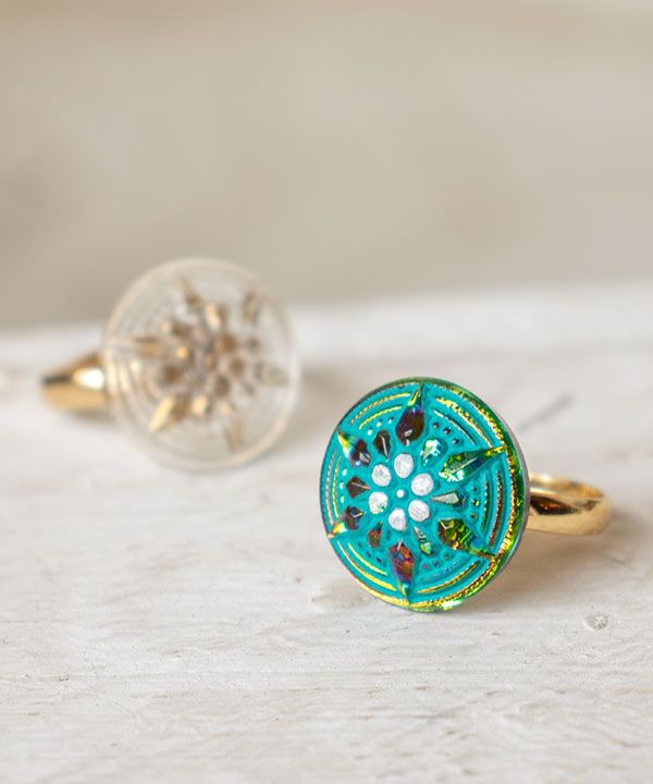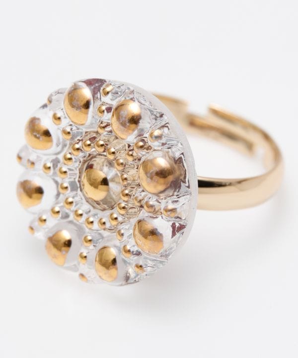 色とりどりの繊細なデザインが愛らしいチェコ・ボヘミア地方のガラスボタン。現地の工房では昔ながらの手作業でひとつひとつ丁寧につくられています。そんな魅力あふれるガラスボタンを現地から直接仕入れ、素敵なリングに仕立てました。レトロな雰囲気が印象的。ひとつひとつ微妙な違いがあり、手作りならではの味わいをお楽しみいただけます。大きめサイズでコーディネートのアクセントに。