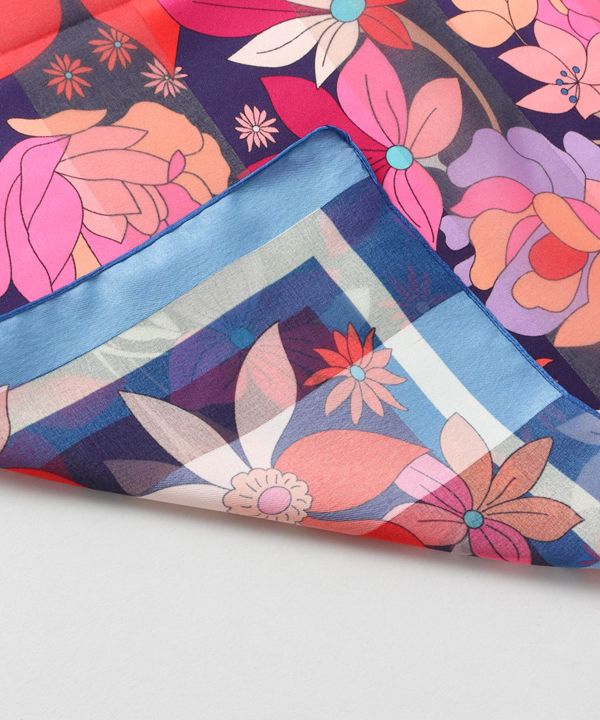 日々のコーディネートに華やかさをプラスする、北イタリアから届いたレトロなスカーフ。アクセサリー感覚で取り入れて、お顔周りを明るく彩ります。大判の花柄が印象的。