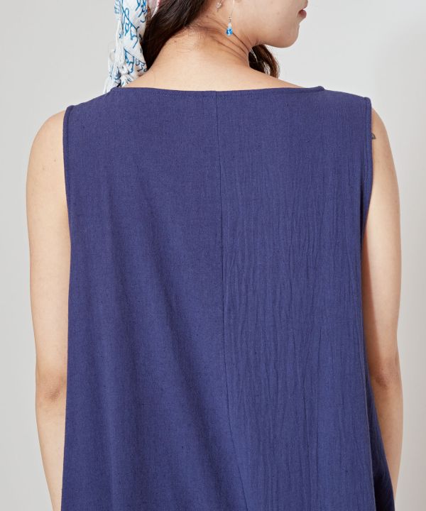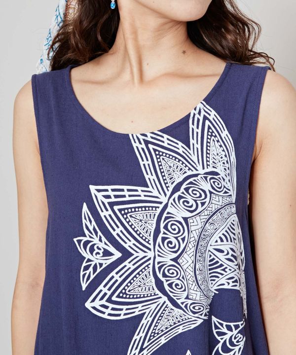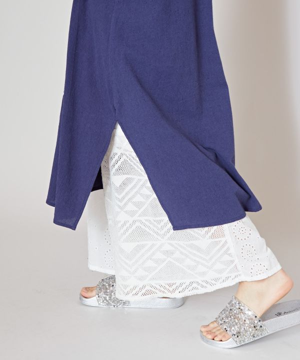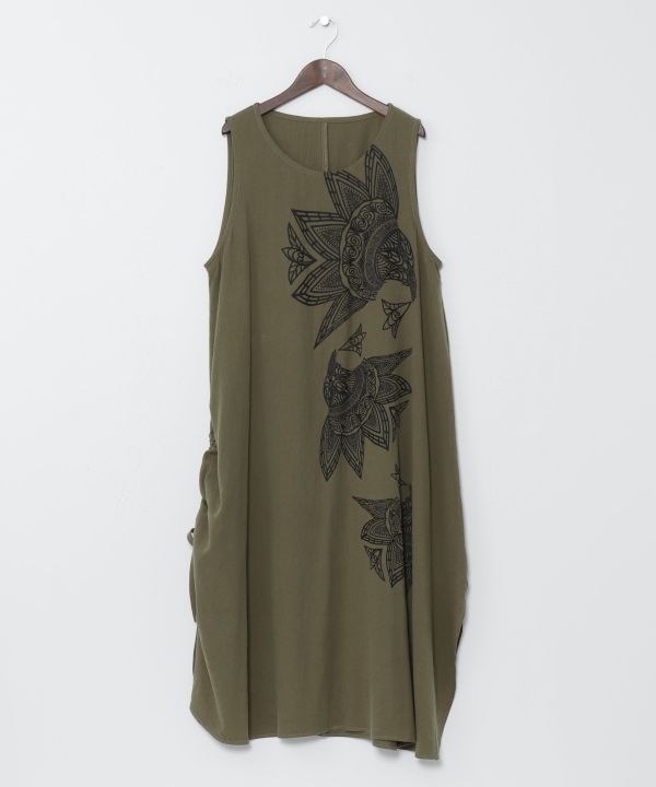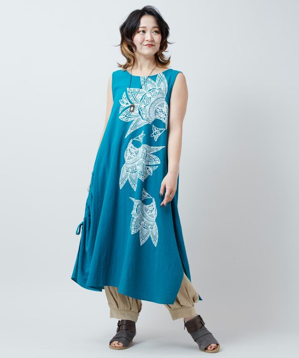 スペイン伝統の金銀細工「ダマスキナード」から着想したデザインワンピース。シルエットが個性的。サイドの紐で変形も楽しめる1着。柔らかく肌触りの良い綿素材。