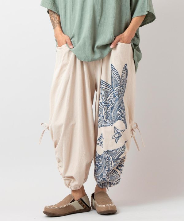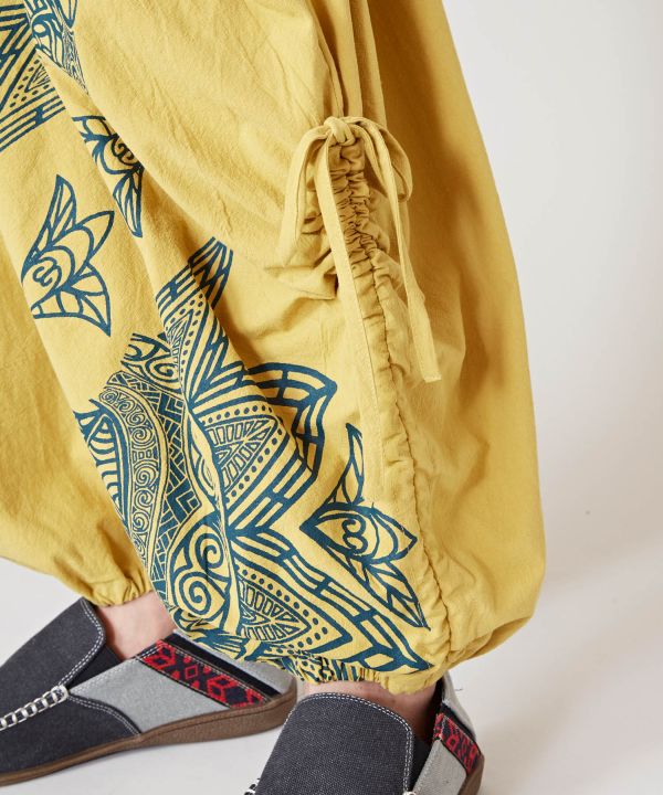 スペイン伝統の金銀細工「ダマスキナード」から着想を得たワイドパンツ。大胆なプリントとドローストリングで変形シルエットを演出。ゆったりシルエットと深めポケットも魅力。