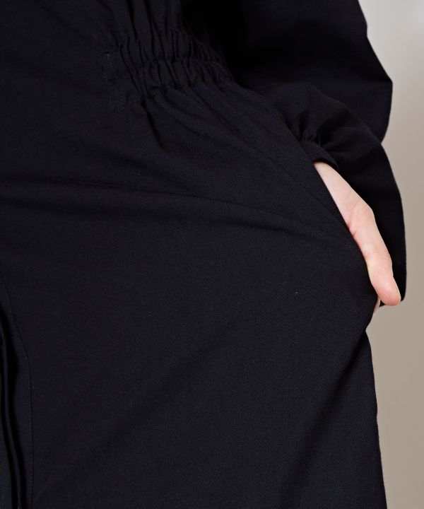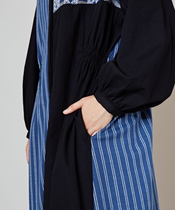 アシンメトリーなデザインに心奪われる。異素材を組み合わせたシャツワンピース。英雄的な強さという意味を持つキリムの柄「羊の角」をあしらったジャカード素材が目を惹く。伸縮性のあるストライプ部分がストレスフリーな着心地を演出。ウエストのゴムには全体の印象を引き締める効果がありモードな雰囲気を引き立てる。両サイドにはポケット付き。洗練された風合いをあなたに。