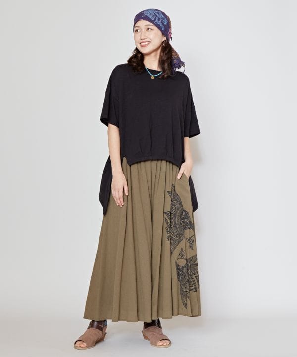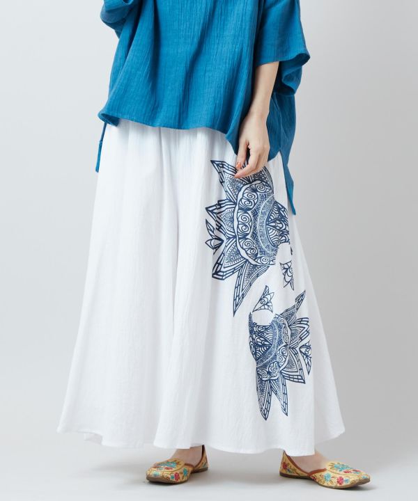 スカート見えするボリューム感のワイドパンツ。スペイン伝統の金銀細工「ダマスキナード」から着想を得た大胆な柄と綿素材の軽やかさ。裏地付きで透けにくく、一枚で安心して着用可能。