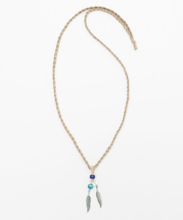 自然と調和する。海面から光が差し込む神秘的な海の色をイメージした蓄光ホタル玉のネックレス。フェザーパーツとの組み合わせが風に揺れる。編みこまれた革紐とホワイトハーツ調のパーツが目を惹く。