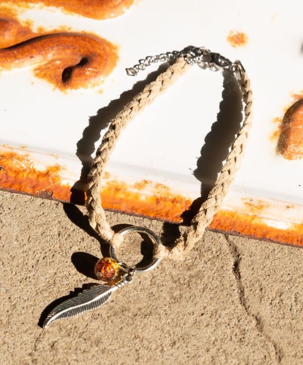 自然と調和する。海面から光が差し込む神秘的な海の色をイメージした蓄光ホタル玉のアンクレット。フェザーパーツとの組み合わせが揺れて風を感じることができる。編みこまれた革紐が目を惹く一品。