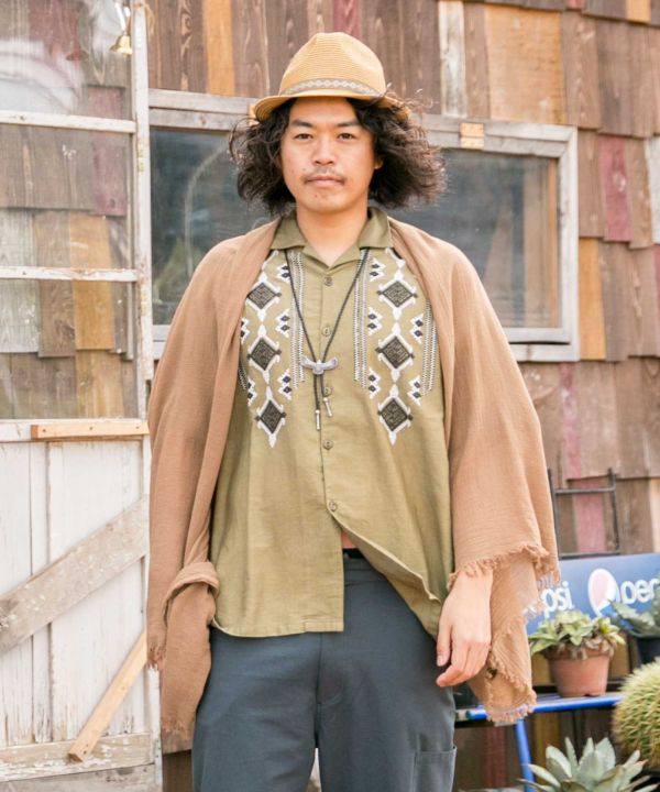 心地良いコットン生地が風に揺れる。ショールとして纏うのはもちろん、ストールやカーディガンとしても使えるWAY仕様。リンクル加工された風合いのある綿素材。深みのあるカラーリングがコーディネートを格上げ。ユニセックスで着用可能。軽やかに纏って、旅に出よう。
