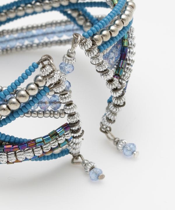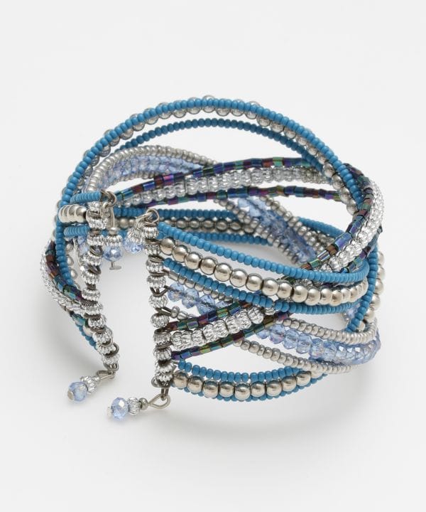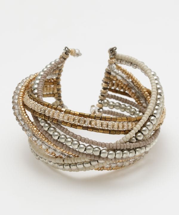 一目見れば心を奪われる。キラキラと輝くビーズがポイントのイージーバングル。大ぶりなバングルは手元を華やかに彩る。インパクトがありながらも、どこかくすんだようなカラーリングがコーディネートに馴染み、程よいアクセントに。