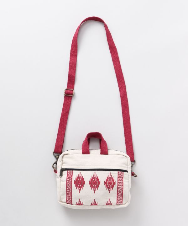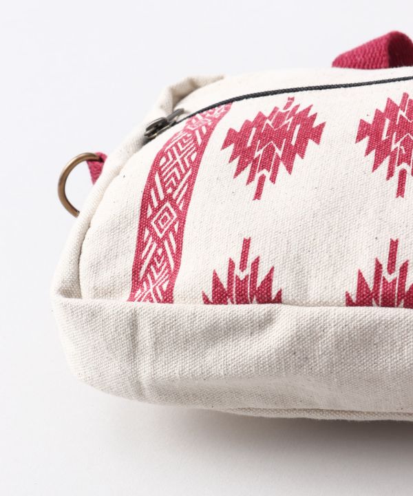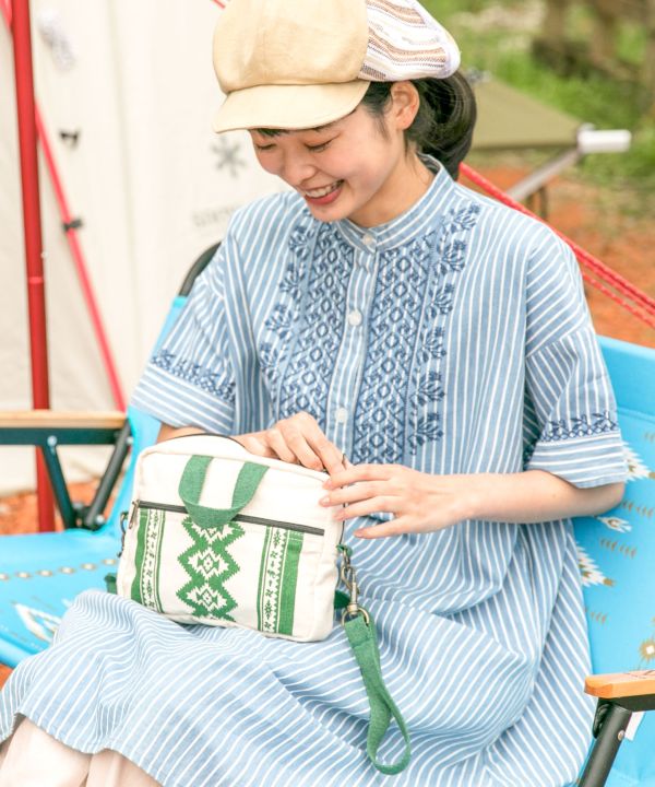 個性とこだわりをあなたに。チャイハネオリジナルのNOMADYシリーズ。シンプルなキャンバス地にビビッドカラーのネイティブ柄が映えるミニショルダーバッグ。デイリーユースはもちろん、旅先やアウトドアシーンで、必要なものだけを入れて、身軽に楽しめる。肩紐は外すことができて、ビッグポーチとしても使用可能。外側と内側に1つずつポケット有で多収納が可能。日常に他にはない個性を。