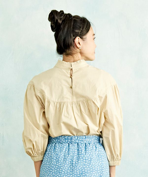 首もとのフリルが女性らしいヴィンテージ風ブラウス。前後どちらでも着用可能な2WAY仕様です。チェコのボヘミアガラスのボタンがアクセントに。袖にはゴムを使いすっきりとしたシルエットに。ベーシックな色味でシンプルながらも、ディティールにこだわった上品な1枚です。