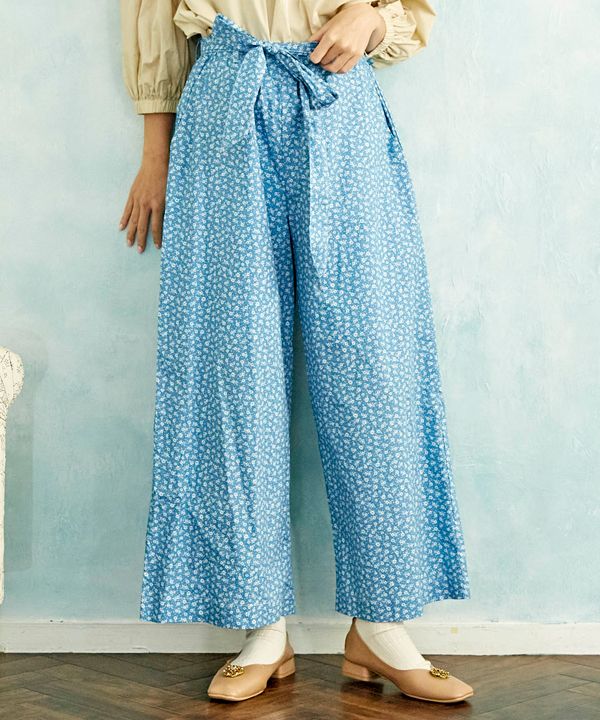 波風に吹かれて船で旅をしているような気分にさせてくれるワイドパンツ。オランダをイメージしたクラシックな小花柄がかわいい。ベルトループにはチェコビーズのチャームが輝きます。アクセントのリボンをぎゅっと結べば都会的な印象に。ウエストにはゴムが入っており、やわらかくさらりとした生地感なので、お家でのリラックスタイムにもぴったりです。腰周りには裏地が付いているので安心。サイドポケットも付いています。