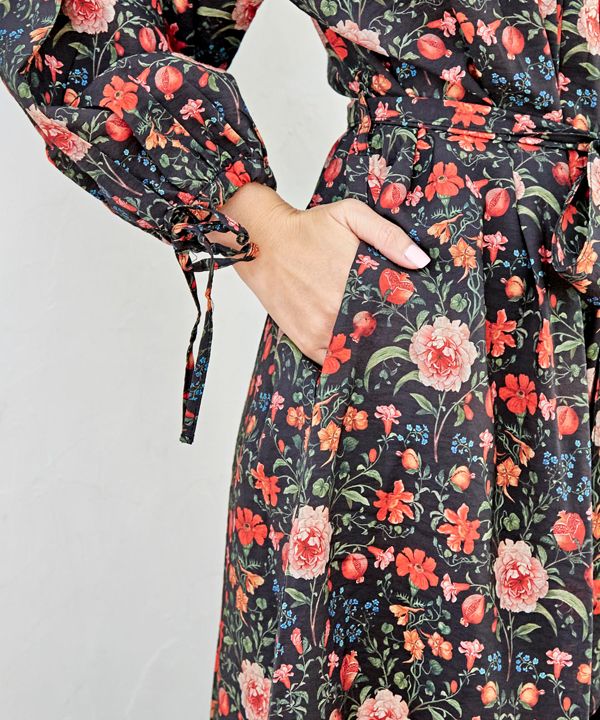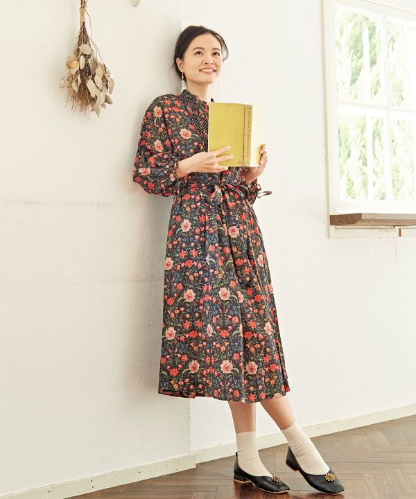 波風に吹かれて船で旅をしているような気分にさせてくれるワンピースです。チェコのボヘミアガラスのボタンがアクセント。スペインをイメージしたクラシックな花柄がかわいい。胸元のピンタックデザインやウエストのリボンがどこかレトロな雰囲気です。袖口にも調節可能なストリングをあしらい、細部にこだわりが。さらりと1枚で着るだけでお洒落に仕上がる主役級ワンピースです。