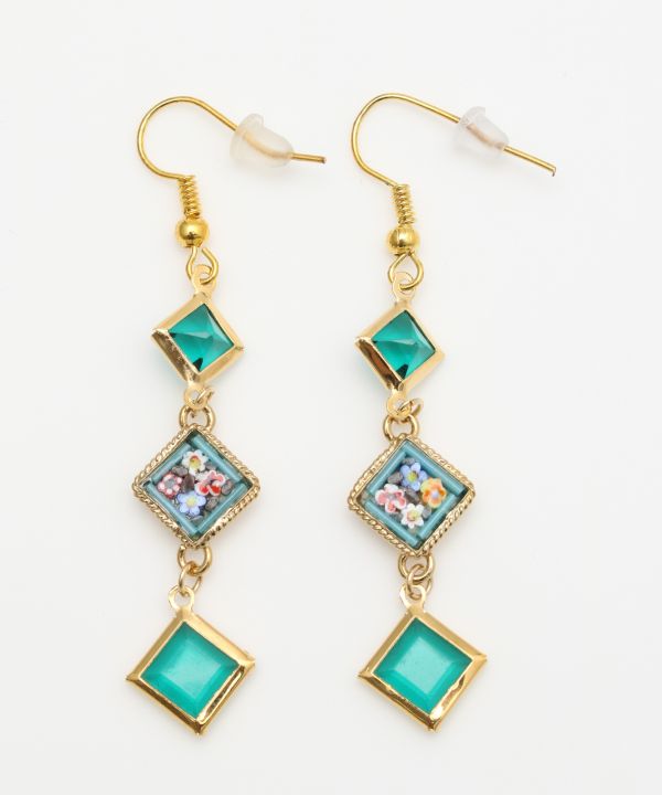 息を呑むほどに美しい、イタリア・フィレンツェの伝統技法「ガラスモザイク」で作られたミニピアス。1mmほどのベネチアンガラス(ムラーノガラス)をフレームにはめ込んで、お花などの模様を表現しています。昔ながらの職人の繊細な技が光ります。ゆらゆら揺れてきらめくスクエア型のパーツを贅沢にあしらい上品な印象に。身に着けてちょっと嬉しくなるアイテムです。※手作りのため、ベネチアンガラス部分は色や柄が一つ一つ異なるアソートです。