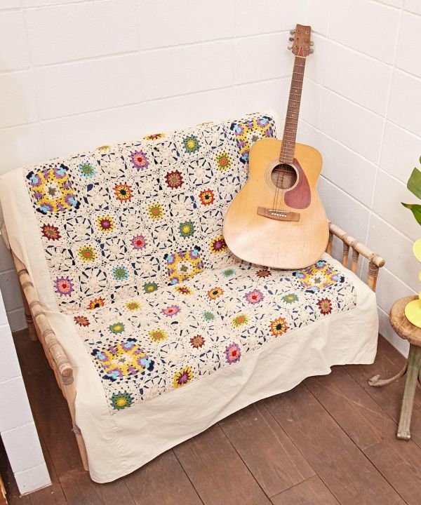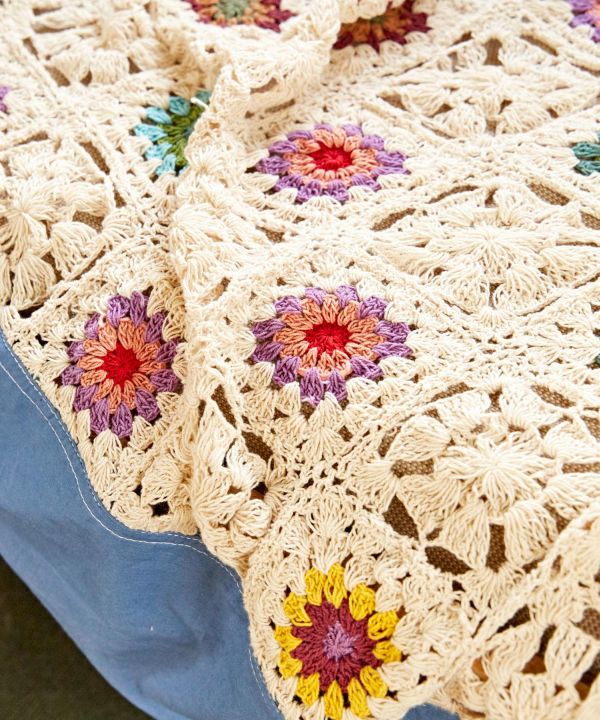 心奪われるかぎ編みクロッシュ。ネパールの伝統技術のクロッシュは、ひと編みひと編み丁寧に編まれ、無限のデザインを持つ。ループ付きなので、キャンプでタープクロスとして飾れば、他にはない個性が光るはず。職人の技に思いを馳せながら広げるたびに贅沢な空間を演出してくれるだろう。