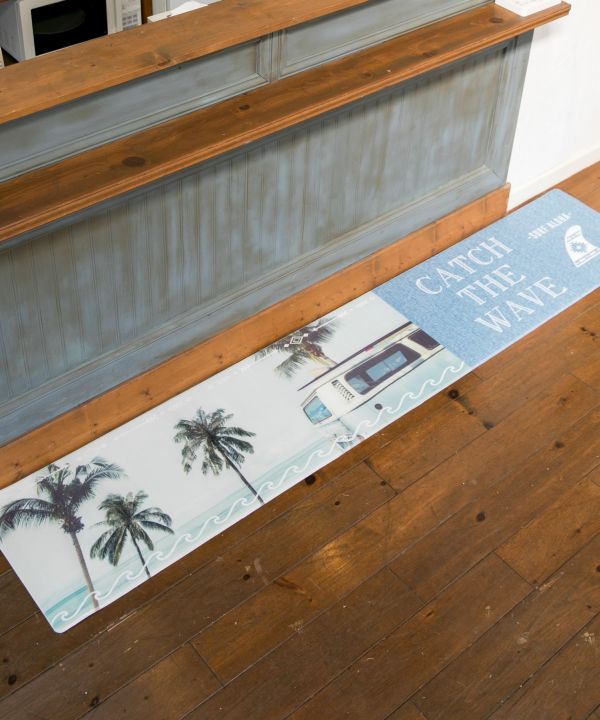 プルメリアやホヌなどハワイを代表するモチーフを描いたPVCマット。230cmサイズは広めのキッチンやリビングにぴったり。防水仕様でお手入れ簡単、やわらかな踏み心地で長時間の立ち仕事にもおすすめです。裏面滑り止め加工付き。