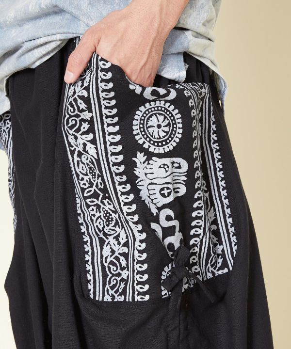 【タイ直輸入】ポケット部分にワンポイントで施されたタイ現地の模様が魅力的なサルエルパンツ。サイド部分は絞り上げられているため、正面だけでなく横から見ても一味違う印象を与えられる。ユニセで着られる一枚。