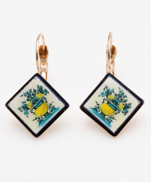 ブルーを基調とした爽やかなカラーのタイル柄が涼しげなフックピアスです。ポルトガルで長い歴史を持つ芸術タイル「アズレージョ」からインスピレーションを受けて作られました。ゆらゆら揺れて、存在感のある耳元を演出してくれます。ポルトガル出身・フランスのジュエリーデザイナー「イネス・ラミー」の作品。