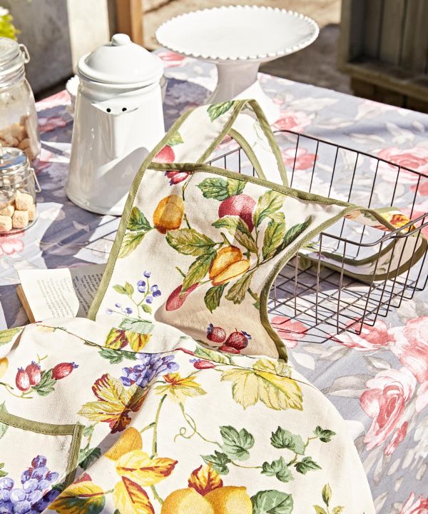 ヴィンテージ感のあるお花やフルーツの柄が華やかなエプロンです。イタリアのロンバルディア州から直接買い付けをしました。さらりと気持ちのいい肌触り。温かみのあるキッチンウェアで、毎日のお料理も楽しくなります。