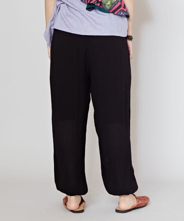 きれいなシルエットが魅力のパンツ。ベリーダンスをイメージしたデザイン。ゆったりシルエットとさらりとした肌触り。裾スリットと裏地付き。