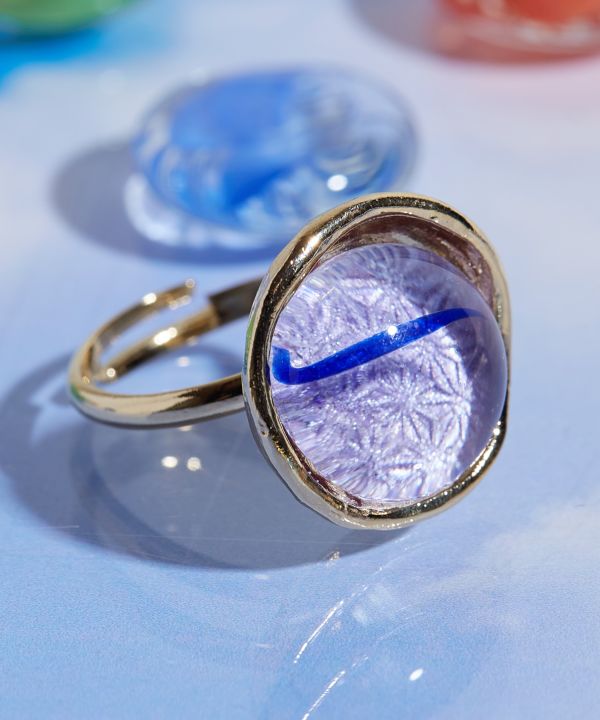 昔懐かしい遊び「おはじき」をモチーフにデザインされた、幼心をくすぐる可愛らしいガラスのリング。光をキラキラと反射する涼しげなアクセサリーは、夏のお出掛けをいっそう愉しくします。同じ色のピアスやイヤリングとあわせてのコーディネイトもおすすめです。