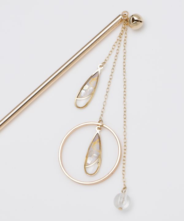 まるで水彩絵の具を滲ませたような美しい色彩のかんざし。透明感溢れるカラーリングと和のモチーフで夏の日の結わいた髪を涼しげに彩ります。小ぶりの鈴と揺れるビーズが涼やかな印象を与えるので、着物や浴衣にもおすすめです。