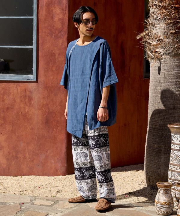 唯一無二のこの形。スタイリッシュに決まるタンクトップ付きのメンズトップス。歴史的建造物 ブルーモスクの伝統的なテキスタイルからインスパイアを受けた刺しゅうデザイン。トップスとインナーは同系色でまとめることで雰囲気を演出。トップスは肌触りの良いレーヨン麻を使用し、快適な着心地。こだわりのアイテムを自由に纏おう。
