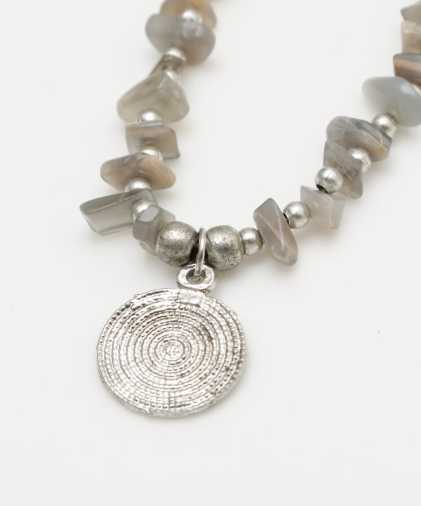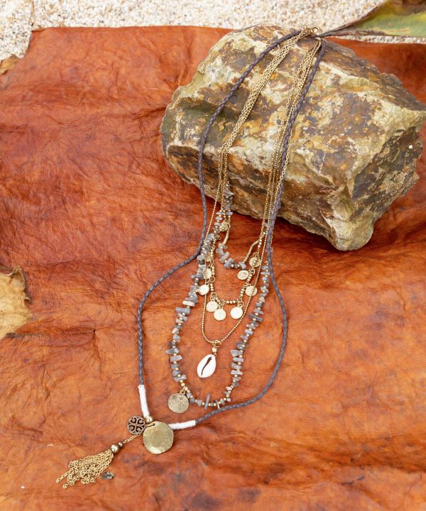 コインモチーフは「幸運」や「金運」をもたらしてくれる、魅惑のモチーフ。5連で天然石が入った存在感抜群のネックレス。