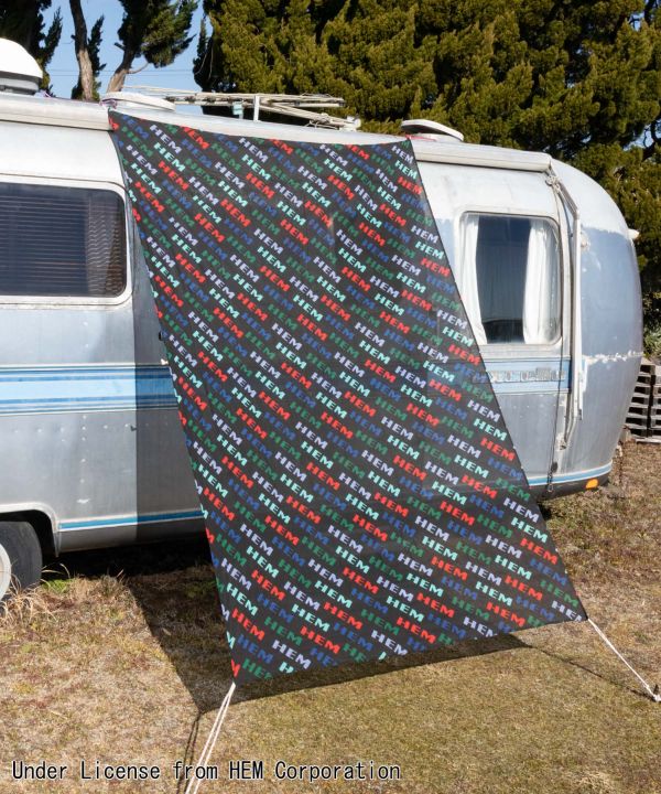 お香の世界トップブランドHEM(ヘム)社とのコラボアイテム。カラフルなHEMロゴの柄が楽しい。ベッドやソファーカバーとしてはもちろん、キャンプでは6箇所のループを引っ張りタープクロスとしても大活躍。