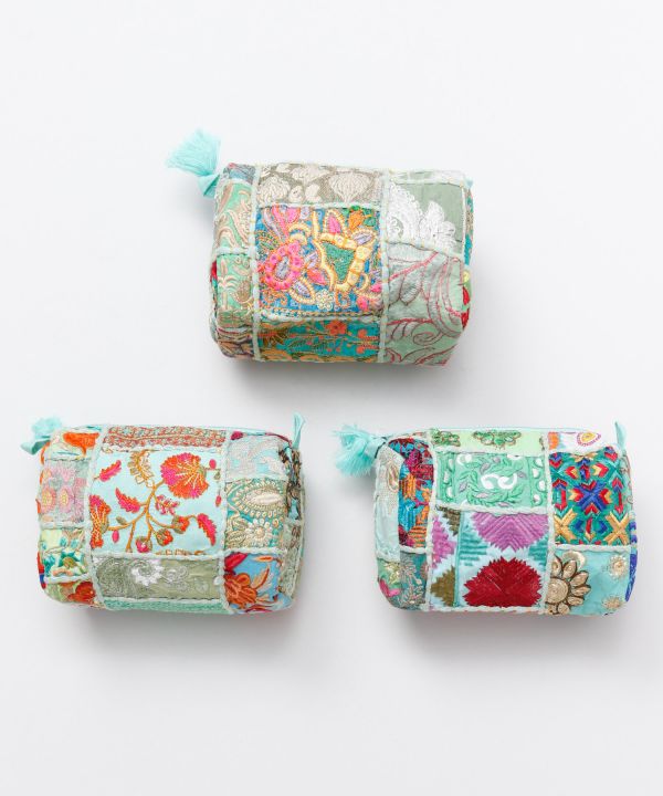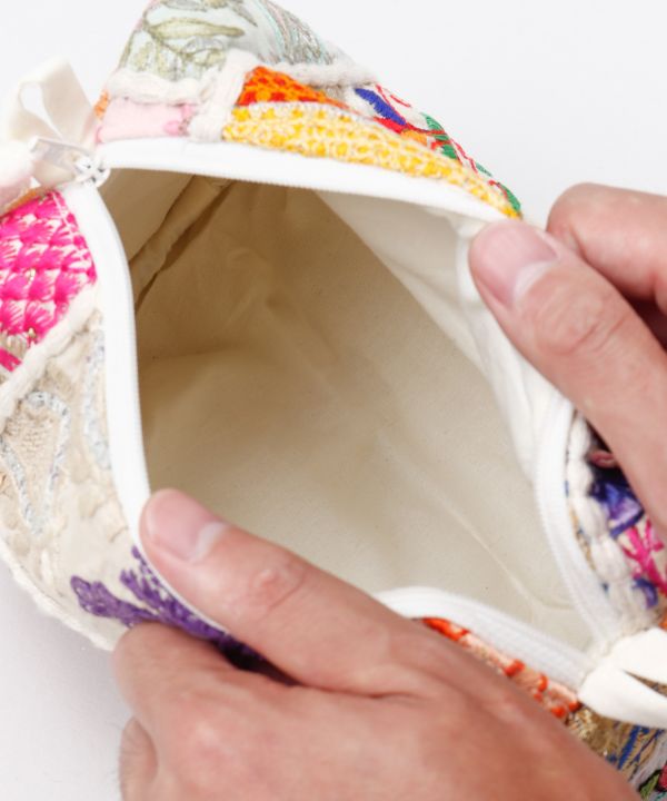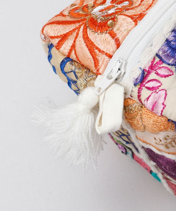 【インド直輸入】世界にひとつだけのザリ刺しゅうポーチ。ザリ刺しゅうとはインドの伝統的な刺しゅう技法で、金や銀などのモール糸を釣り針のような針で縫いつけて模様をつくるものです。マチがあるので、化粧ポーチとしてもおすすめ。お持ちのバッグベルトと合わせれば、ショルダーバッグにもなります。両端にループ付き。※柄や生地が一つ一つ異なるアソート商品です。柄や生地はお選びいただけません。※商品の特性上、多少のほつれや破れがございます。