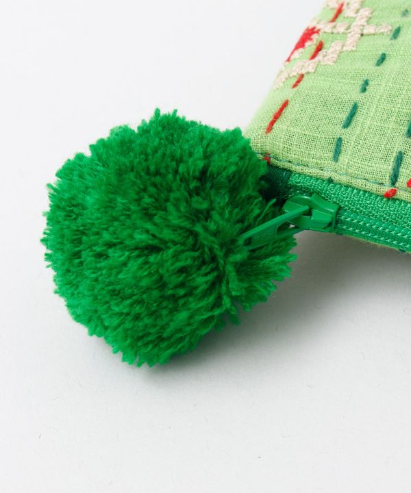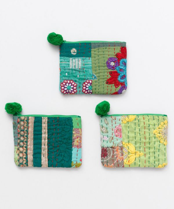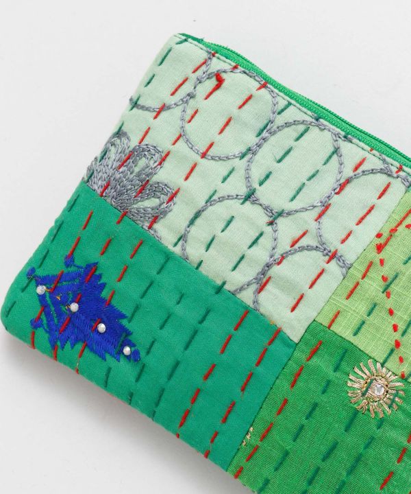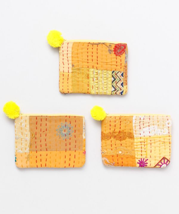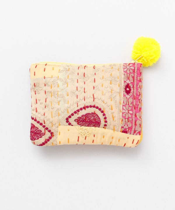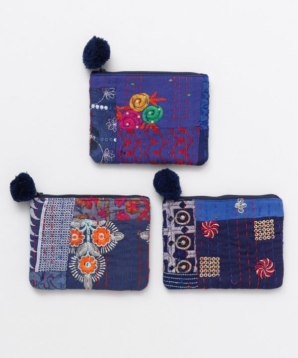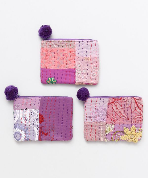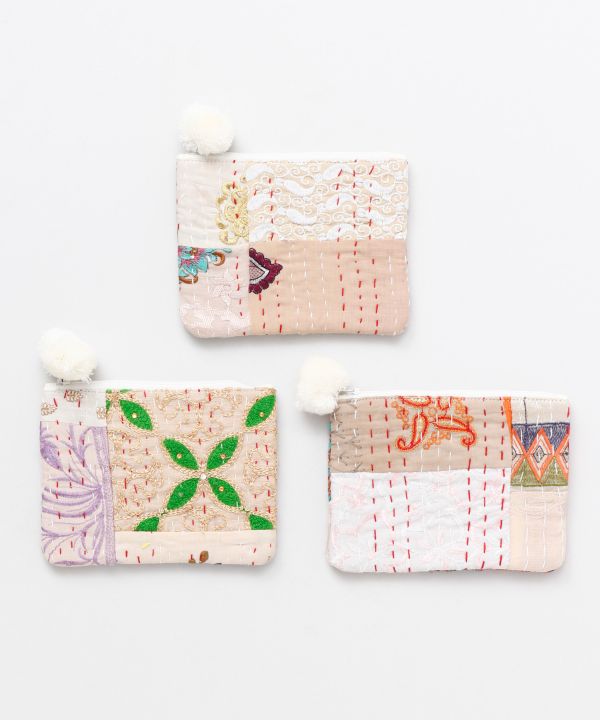 【インド直輸入】バティックに刺し子施したミニポーチ。※一つ一つ柄の出方や生地が異なります。※一点をお届けします。