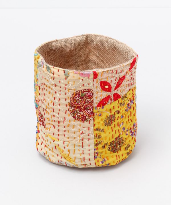 【インド直輸入】バティックに刺し子施したバケツ型のマルチケース。※一つ一つ柄の出方や生地が異なります。※一点をお届けします。