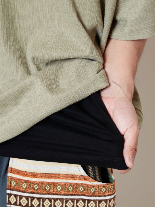 シンプルの中にこだわりを。表面感のあるニット素材が魅力のドルマンスリーブメンズトップ。裾の変形に心が奪われる。嬉しいタンクトップ付き。どんなコーディネートにも合う万能アイテム。シンプルだからこそ、あなたの個性を引き立てる。