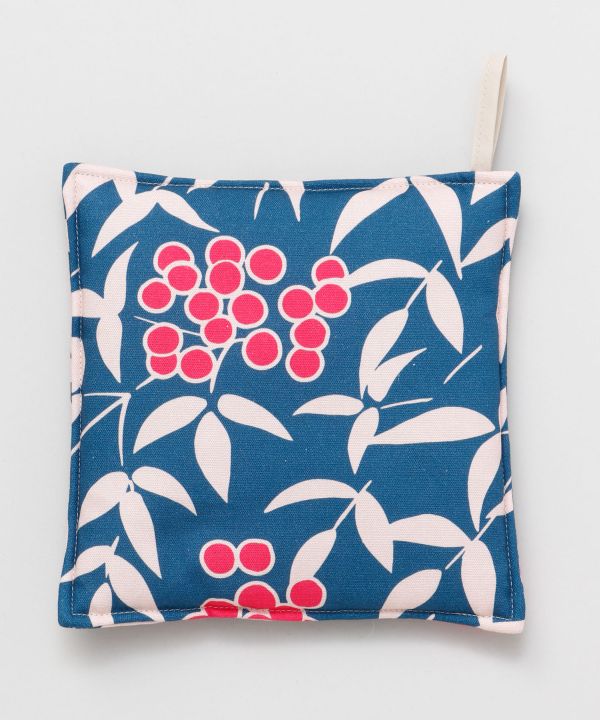 厚手で丈夫な綿素材の鍋敷き。肉厚なので、大切な家具を熱からしっかり守ります。縁起の良い「南天」柄を彩り豊かにデザイン。食卓周りを華やかに彩ります。