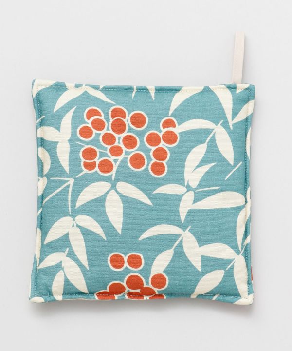 厚手で丈夫な綿素材の鍋敷き。肉厚なので、大切な家具を熱からしっかり守ります。縁起の良い「南天」柄を彩り豊かにデザイン。食卓周りを華やかに彩ります。
