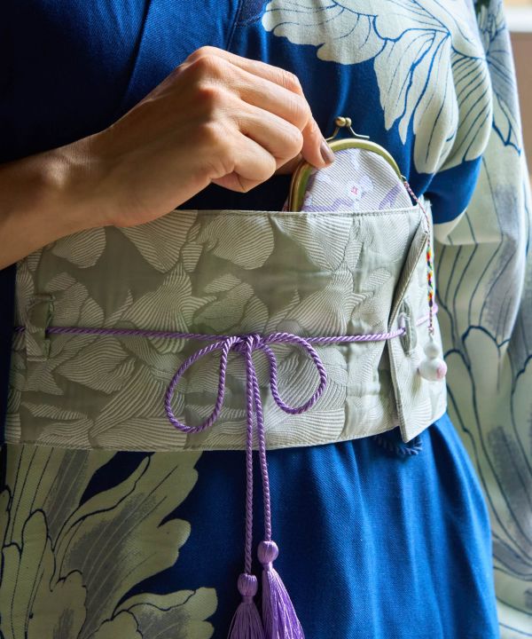 ハレの日に持ちたい華やかな印象のシリーズの帯。凹凸のある独特な手触りが特徴の「ふくれ織り」を使用。高級感あふれる、繊細な花が美しいデザイン。巻いて紐を結ぶだけの簡単帯ベルト。コーディネートのアクセントに帯を巻くことで簡単に和装の雰囲気を作れるアイテムです。