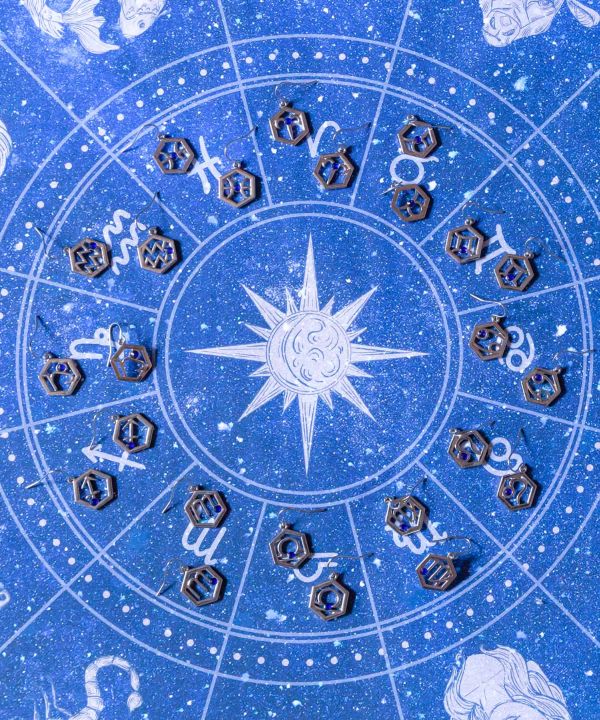 空に輝く星座たちをお守りに。きらりと輝く青いストーンが美しいピアスです。直線を基調としたシンプルなデザインで、性別を問わずに身に付けられます。大切な方への贈り物にもおすすめです。