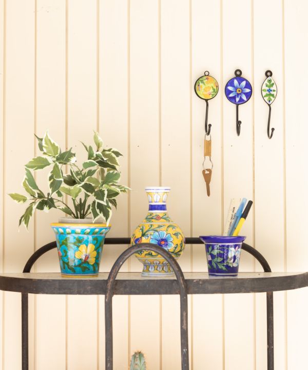 インド直輸入のジャイプール伝統工芸品。ブルーポタリーの陶器が用いられていて、上部の穴に押しピンを入れれば簡単に取り付けが可能。アイアン製で磁石もつくのでマグネットに取り付けたりできる。インテリアの彩りにおすすめ。