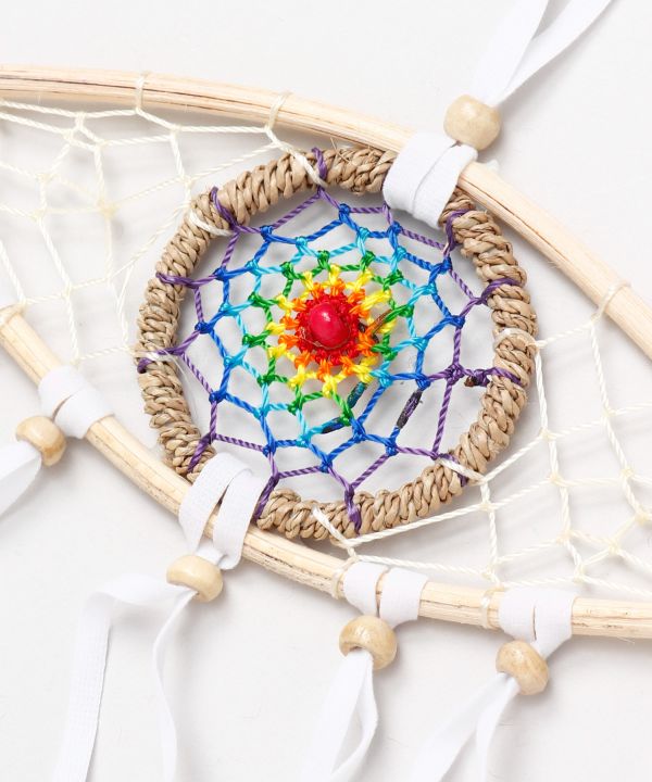 目玉の型のバンブーフレームが特徴のドリームキャッチャー。「悪夢から守り、幸運を運ぶ」という意味が込められています。