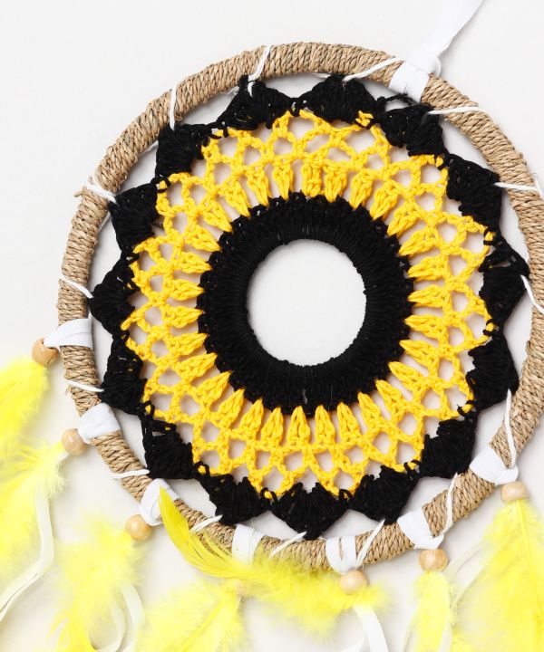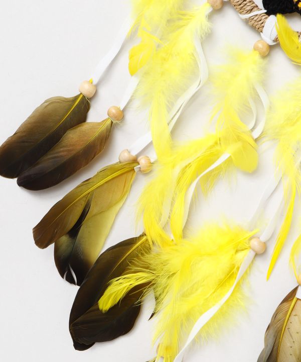 カラフルな色使いのドリームキャッチャー。悪夢から守り、良い夢は網の中心から羽を伝って人に幸運を運んでくれるとされています。