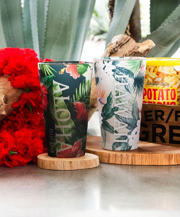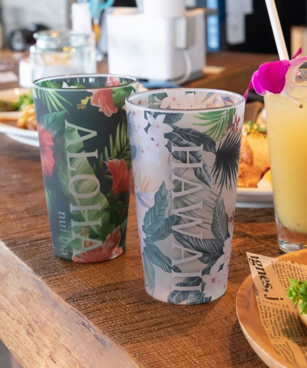 HAWAIIのハイビスカスとプルメリアがそれぞれに描かれた、上品で大人の雰囲気なボタニカル柄のグラス。光に透けるとさらに美しいグラスです。ギフトにもおすすめです。電子レンジ使用不可。食洗機使用不可。