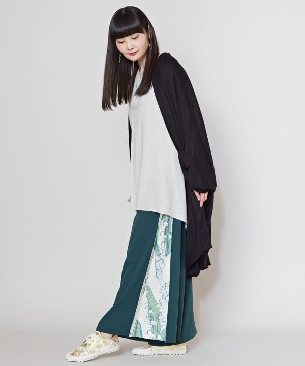歩くたびにちらりと見える春の花々が美しい八掛(はっかけ)のパンツ。袴の形をもとにリデザインし、ゆったりとした裾が特徴です。柔らかく軽いポリエステル素材で快適な穿き心地。無地の表面に対し、歩くたび現れる花柄がさりげない華やかさを添えます。ウエストはゴム仕様で楽に着用いただけます。