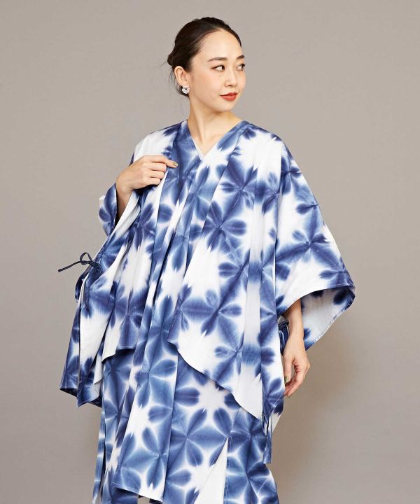愛知県の伝統染物、有松絞りの一つ「雪花絞り」で手作業で染め上げた羽織り。脇には岡山県の伝統の真田紐がアクセントで付いています。普段使いや着物と合わせて使える。しっかりとした厚みのある綿素材。