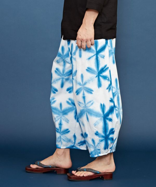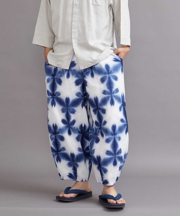 愛知県の伝統染物、有松絞りの一つ「雪花絞り」1枚1枚手作業で染め上げたもんぺ風パンツ。ポケットには岡山県の伝統の真田紐がアクセントで付いています。ポケットの形は「波」を表現し、扇子などを入れやすい縦長細みのポケット付き。しっかりと厚みのある綿素材で男女兼用でお使いいただけます。