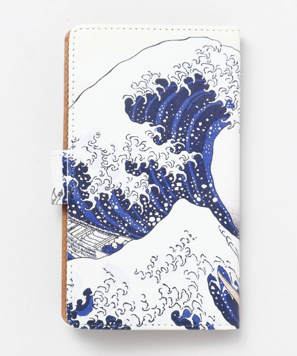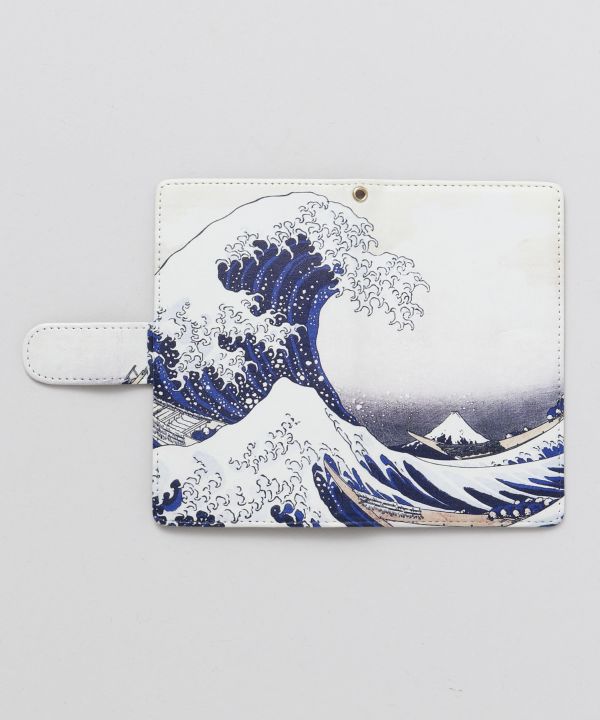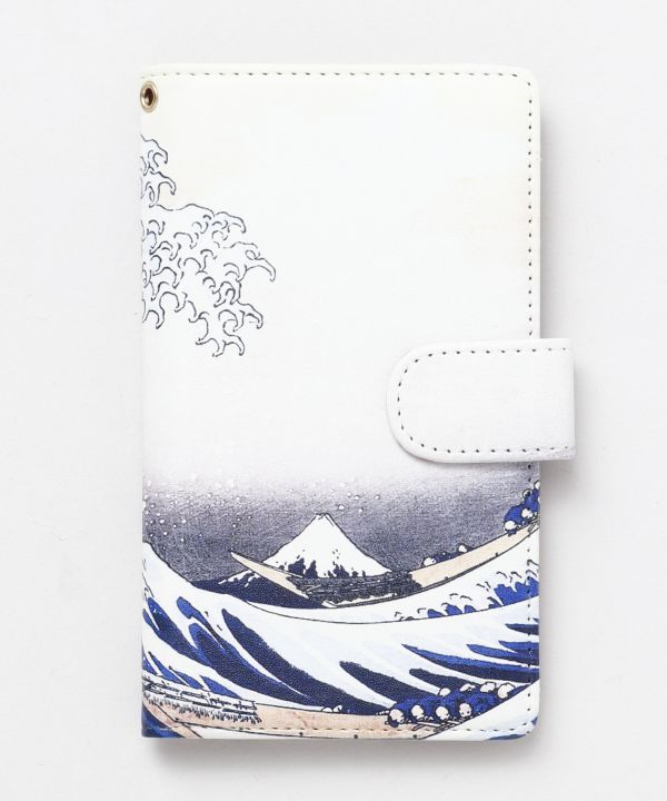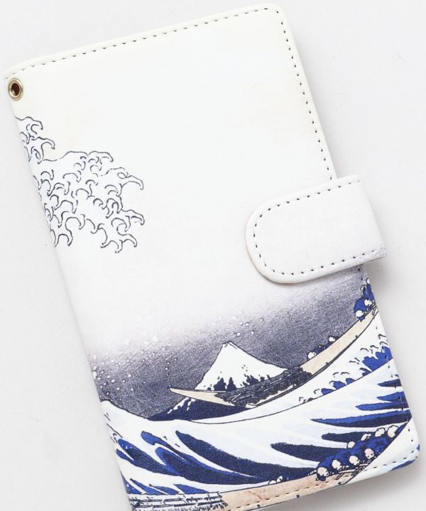 北斎作品の中で最も知られている「富嶽三十六景」の一つの浮世絵。多機種対応の手帳型スマホケース。スライドUP式でのカメラ対応です。指1本で簡単にスライドできます。強力な再粘着シールで貼り付けての使用になります。カードポケット付き。