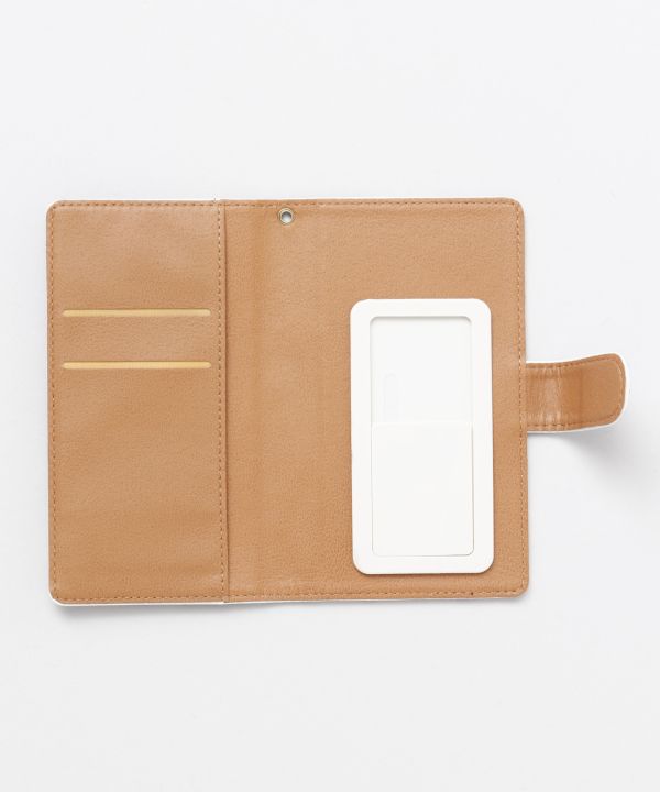 多機種対応の手帳型スマホケース。スライドUP式でのカメラ対応です。指1本で簡単にスライドできます。強力な再粘着シールで貼り付けての使用になります。カードポケット付き。
