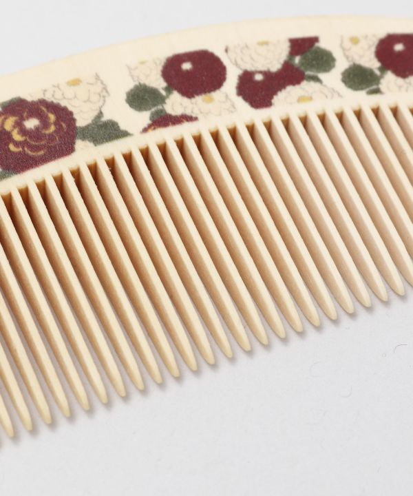 日本の花を上品にデザインした柘植櫛。椿油をたっぷり染み込ませた櫛です。オレイン酸を多く含むため、人の皮膚の成分とよく馴染み、乾燥などから髪や肌を守る働きがあります。