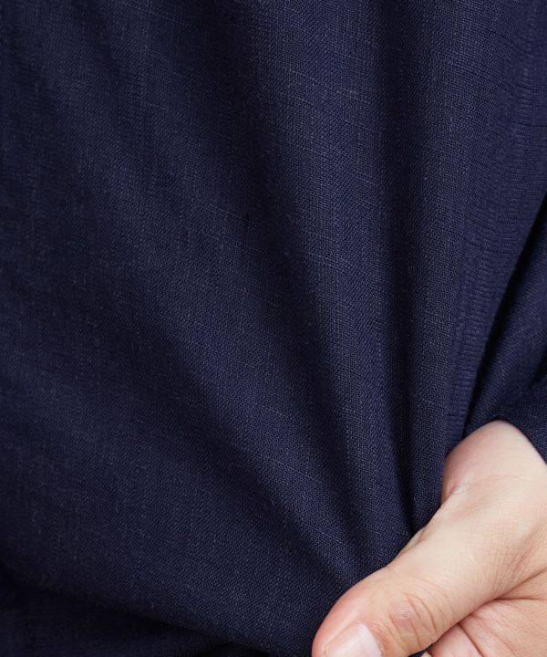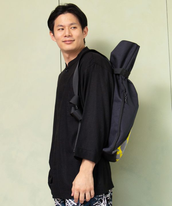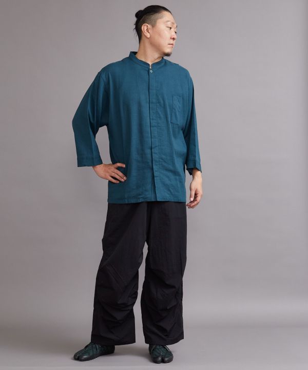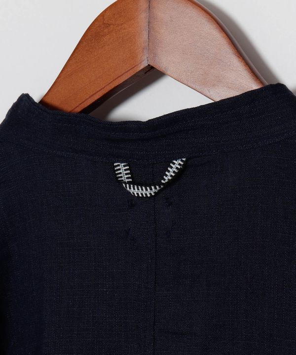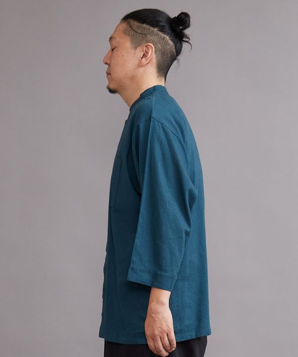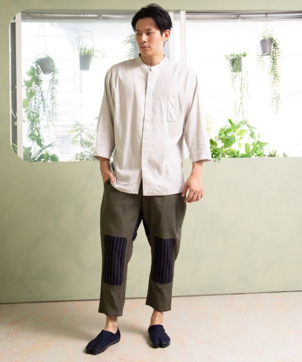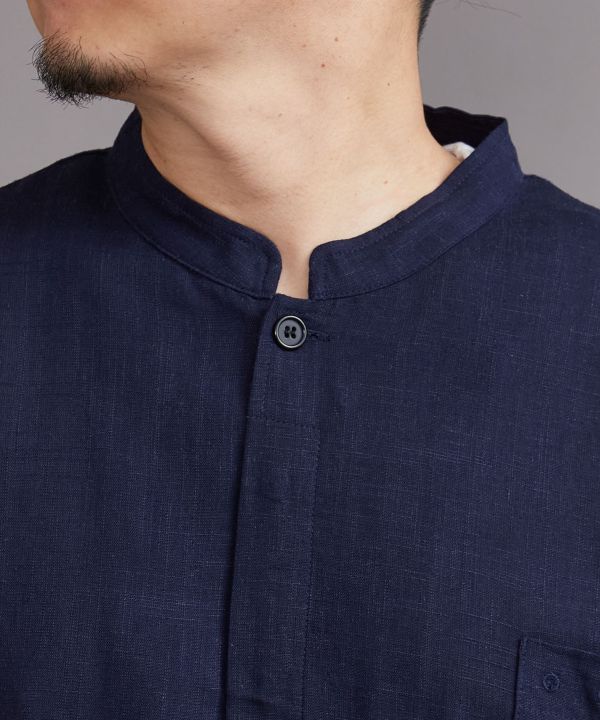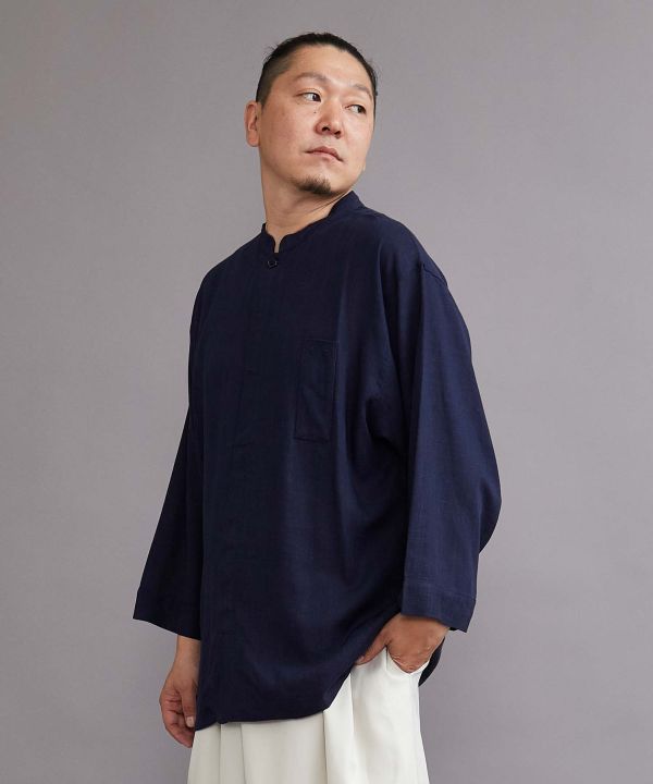 夕日の光を受けて美しいの空の色を表現したメンズシャツ。さらりとした麻混の生地を使用しており、暑い日も涼やかに着られます。大正時代の書生さんをイメージした、和の佇まいを感じられるスタイリングです。着回しやすいベーシックな和の色みも魅力です。後ろ衿には岡山県の伝統織りの真田紐をあしらいました。