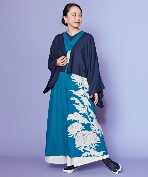 さらりとした肌触りのワンピースと羽織のセットアップ。立ち昇るように描かれた大輪の菊の中には吉祥紋麻の葉が。UVカット加工のついた羽織は、短丈で着物のような大きめな袖が特徴的。お手持ちのお洋服とも合わせやすい色合いの羽織です。